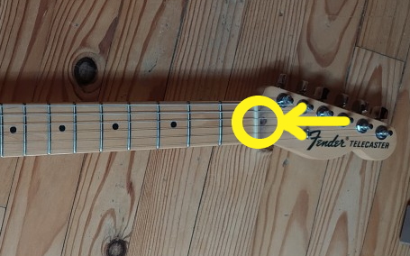 Généralement, sur les Telecaster (sauf modèles très anciens), la vis se trouve au niveau de la tête, dans le petit trou près du sillet.